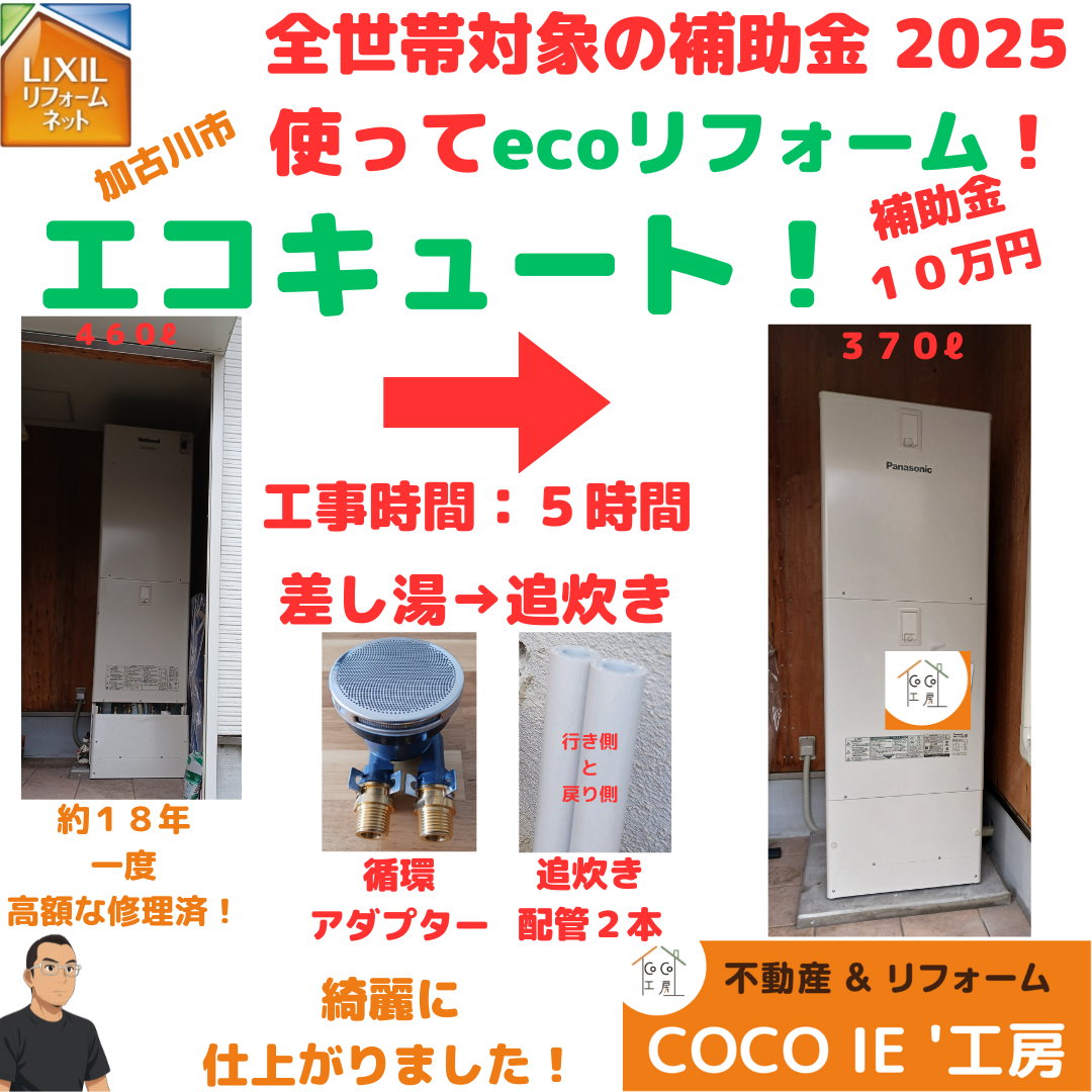 エコキュート!(補助金対象!) 2025 11/01 お知らせ リフォーム 補助金・キャンペーン 2025年11月1日 エコキュート! エコキュート!補助金給湯省エネ202510万円申請料:無料!朝から工事夜にはお風呂に入れます!エコキュートの交換!寒くなる前(秋)壊れる前が、お薦めです!詳しくはお問合せ下さいね! お知らせ リフォーム 補助金・キャンペーン エコキュート リフォーム 先進的窓リノベ2024 加古川市 姫路市 子育てエコホーム 播磨町 断水時 明石市 稲美町 給湯省エネ2024 補助金 非常用水 高砂市 この記事が気に入ったら いいね または フォローしてね! Follow Me よかったらシェアしてね! URLをコピーしました! URLをコピーしました! エコキュート!(補助金対象!) エコキュート!(補助金対象!) この記事を書いた人 COCOIE❜ 工房 50才台から SNS 始めてみました。 関連記事 LIXIL 内窓( インプラス ) 2025年11月1日 LIXIL 内窓( インプラス ) 2025年11月1日 LIXIL 内窓( インプラス ) 2025年11月1日 エコキュート!(補助金対象!) 2025年11月1日 エコキュート!(補助金対象!) 2025年11月1日 令和7年9月6月(土)新聞折込広告! 2025年8月28日 塗装(外壁、屋根、その他)工事 2025年8月17日 塗装(外壁、屋根、その他)工事 2025年8月17日