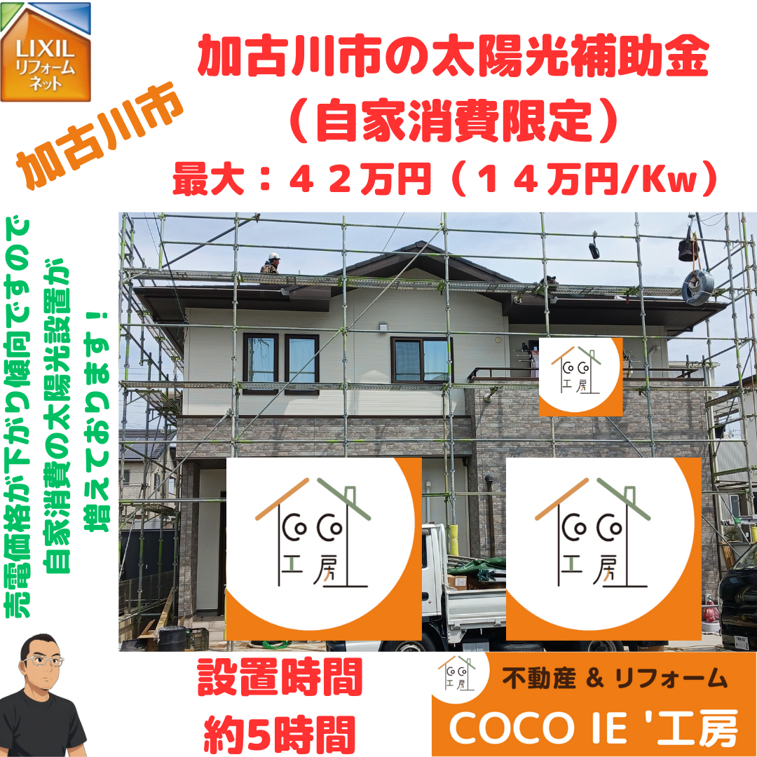 太陽光(自家消費型) 2026 4/10 お知らせ リフォーム 補助金・キャンペーン 2026年4月10日 太陽光!(自家消費型) 光熱費の高騰、不安定対策!加古川市の場合補助金額最大:42万円14万円/1kwあたり上限3kw詳しくはお問合せ下さいね! お知らせ リフォーム 補助金・キャンペーン エコキュート リフォーム 先進的窓リノベ2024 加古川市 姫路市 子育てエコホーム 播磨町 断水時 明石市 稲美町 給湯省エネ2024 補助金 非常用水 高砂市 この記事が気に入ったら いいね または フォローしてね! Follow Me よかったらシェアしてね! URLをコピーしました! URLをコピーしました! LIXIL 内窓( インプラス ) TOTO サザナ(ユニットバス) この記事を書いた人 COCOIE❜ 工房 50才台から SNS 始めてみました。 関連記事 LIXIL Jフィット(トイレ) 2026年4月10日 スイッチ、コンセント、照明(LED)) 2026年4月10日 エコキュート!(補助金対象!) 2026年4月10日 LIXIL リデア(ユニットバス) 2026年4月10日 塗装(外壁、屋根、その他)工事 2026年4月10日 塗装(外壁、屋根、その他)工事 2026年4月10日 塗装(外壁、屋根、その他)工事 2026年4月10日 Panasonic レンジフード 2026年4月10日